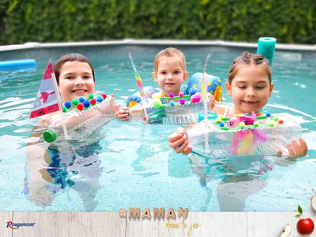 Pour reproduire ces bateaux, il suffit de faire un trou sur le dessus d’une bouteille de jus Rougemont (pour pouvoir accueillir des passagers), puis décorer avec ce que vous avez à la maison! Pour la voile, vous pouvez simplement utiliser une paille et y ajouter une voile en carton précédemment plastifiée.