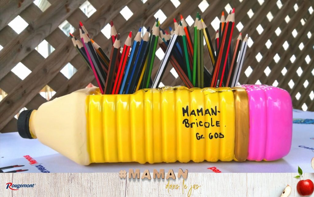 Amusez-vous à faire un «crayon porte-crayons» avec vos enfants en récupérant une bouteille de 2 L de jus de pommes Rougemont.