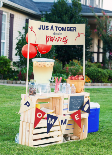 2. La déco : téléchargez, imprimez et installez nos fanions « P-O-M-M-E-S- » et la banderole « Jus à tomber dans les pommes ».